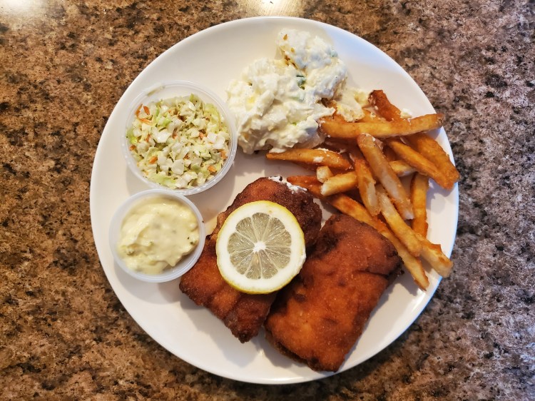- Fish – cod, taste good and not fishy, a bit dry, almost like chicken, thicker coating