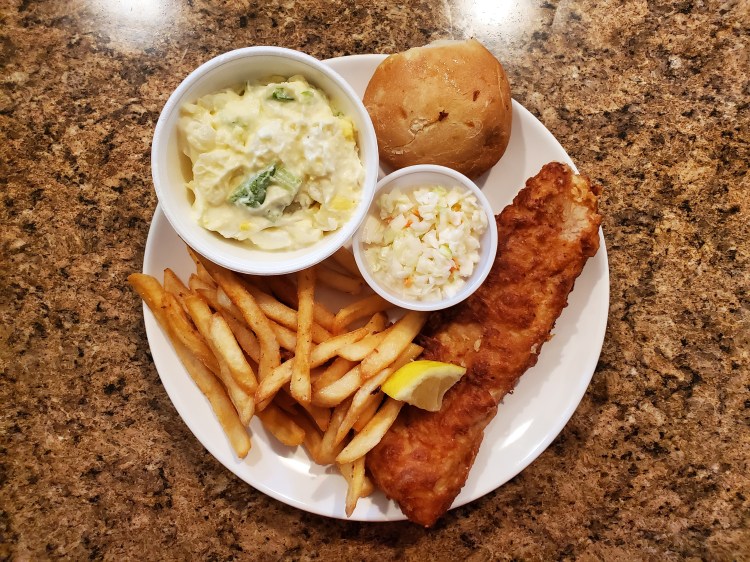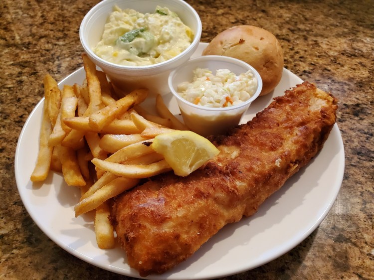 - Fish – cod, battered fried, crispy coating with flaky fish, taste good