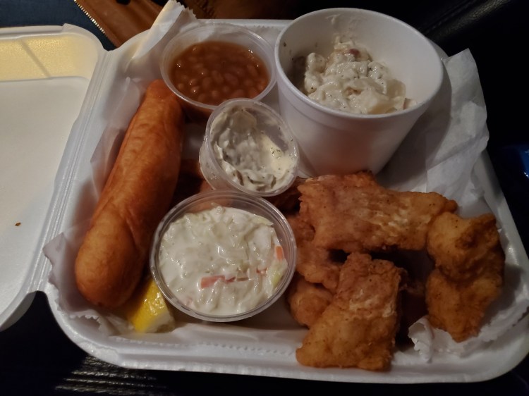 - Fish – cod, small pieces (might be walleye) light, seasoned coating, fried and taste great