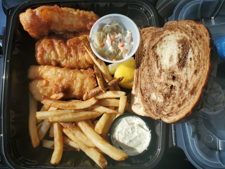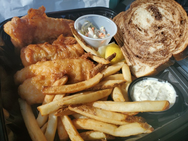 - Fish – haddock, battered and fried, crispy coating, moist and good flavor